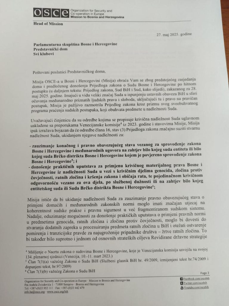 Misija OESS-a u Bosni i Hercegovini uputila je ozbiljna upozorenja Parlamentarnoj skupštini BiH zbog prijedloga zakona o Sudu BiH koji, prema njihovim procjenama, ozbiljno ugrožava učinkovito procesuiranje ratnih zločina, genocida i zločina protiv čovječnosti. Taj prijedlog probošnjačke trojke danas je na dnevnom redu Zastupničkog doma. Ova zabrinutost OESS-a odnosi se na potencijalno smanjenje nadležnosti Suda BiH, što bi moglo otežati pravdu za žrtve ratnih zločina i usporiti tranzicijsku pravdu.