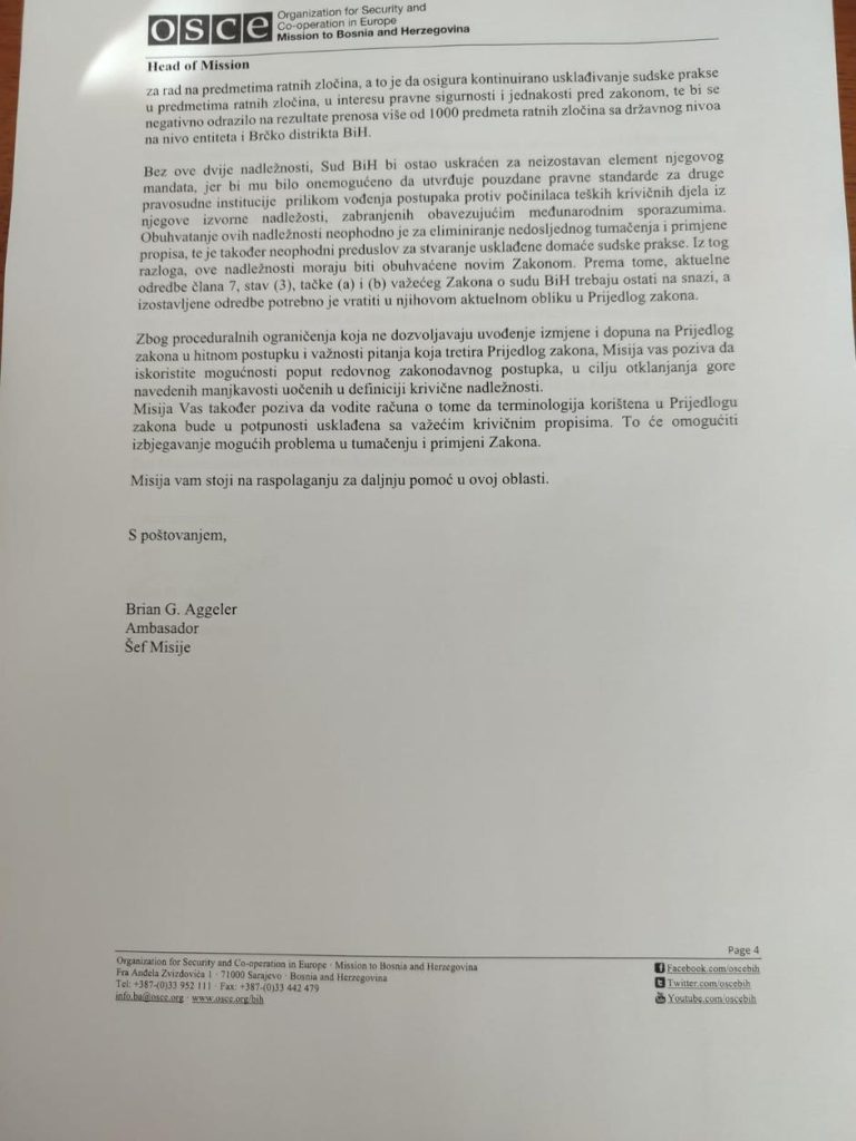 U svom službenom dopisu, Misija OESS-a naglašava ključnu ulogu Suda BiH u procesuiranju najtežih kaznenih djela iz ratnog razdoblja. Posebno su istaknute odredbe predloženog zakona koje bi mogle ukinuti pravno obvezujuće stavove Suda o primjeni domaćih i međunarodnih zakona te otežati donošenje praktičnih uputa za procesuiranje genocida i ratnih zločina. Takve promjene, upozoravaju iz OESS-a, dovele bi do fragmentacije pravosudnog sustava i stvaranja dodatnih prepreka u procesuiranju zločina iz prošlosti.