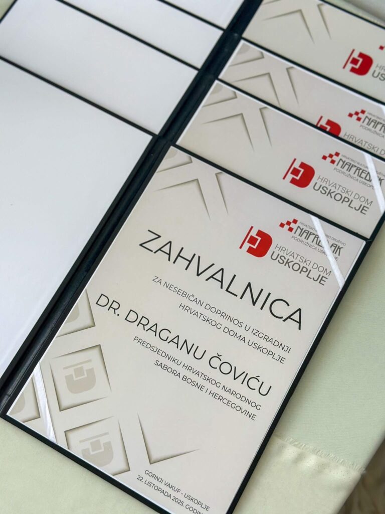 Posebne zahvalnice uručene su predsjedniku Čoviću, državnom tajniku Milasu, Bojanu Domiću i Bojanu Jurini, uz zahvalnost institucijama Republike Hrvatske koje su financijski podržale izgradnju doma. Zaključeno je kako otvorenje Hrvatskog doma „Uskoplje“ predstavlja značajan korak u očuvanju i jačanju hrvatskoga identiteta u Gornjem Vakufu-Uskoplju te postavlja čvrste temelje za buduće kulturne, obrazovne i društvene aktivnosti.