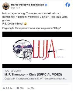“Nakon zagrebačkog, Thompsonov spektakl seli na dalmatinski Hipodrom! Vidimo se u Sinju 4. kolovoza 2025. godine.P.S. Dolazi i Bend!